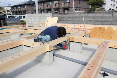 基礎の立ち上がりのない通りに土台や大引きを通します。