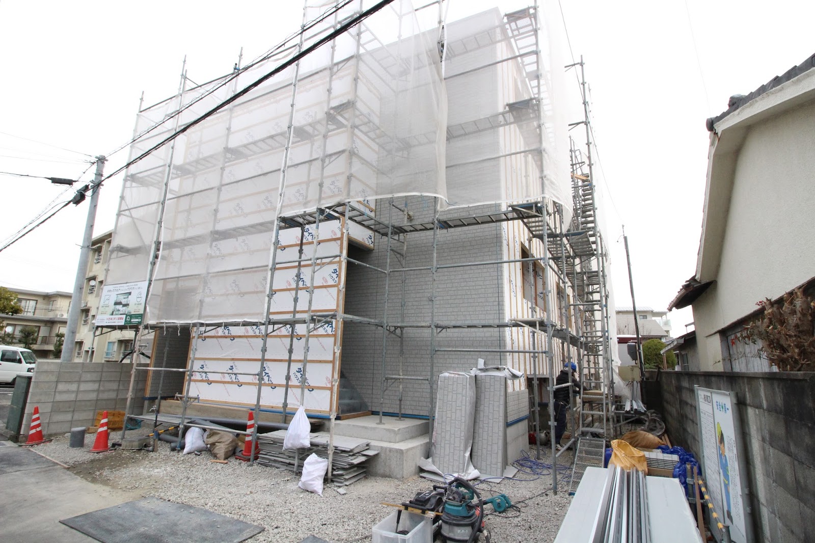 ローカに仮設足場が組まれています。建物側のサイディングは屋根まで貼り伸ばします。高さが高いので仮設足場が必要になります。